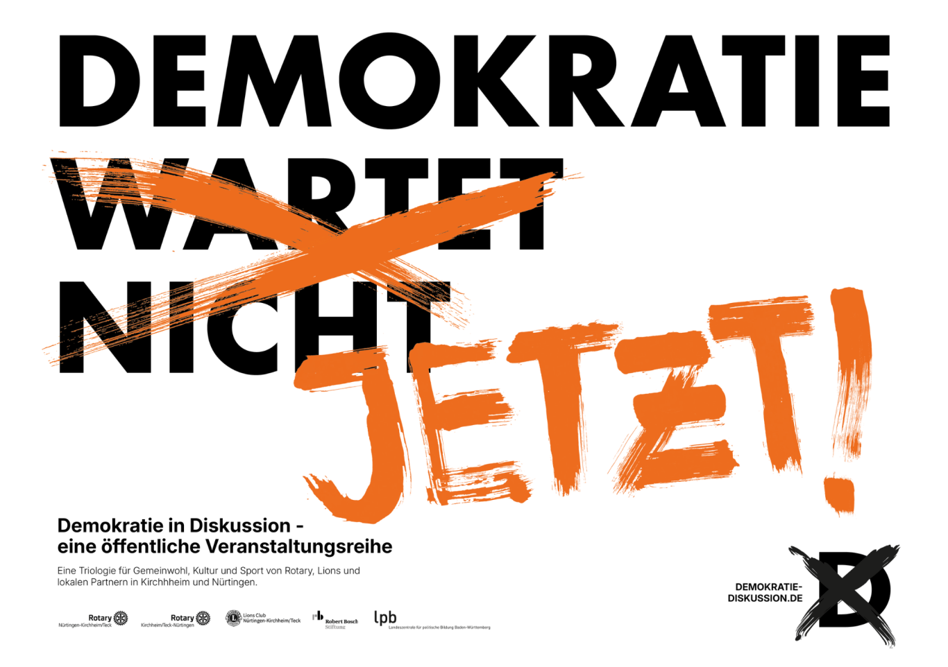 Demokratie ist nie fertig. Sie steht immer wieder vor Herausforderungen, die sich durch gesellschaftliche Entwicklungen ergeben. Deshalb haben die Service-Clubs von Lions und Rotary sich entschieden unter dem Titel „Demokratie jetzt!“ eine dreiteilige Themenreihe anzubieten, die den Blick auf die Grundlagen richtet, auf denen unsere Demokratie ruht: